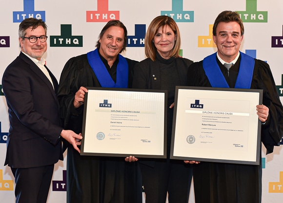 L’ITHQ a profité de l’occasion pour rendre hommage à deux personnalités qui ont contribué de façon exceptionnelle au développement de l’industrie du tourisme, de l’hôtellerie et de la gastronomie québécoise : Robert Mercure, président-directeur général du Palais des congrès de Montréal, et Daniel Vézina, chef-fondateur du restaurant Laurie Raphaël et personnalité bien connue du petit écran.