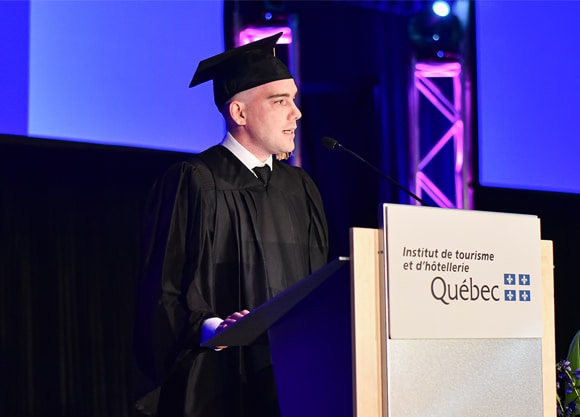 Diplômé des programmes Service de restaurant et Gestion hôtelière internationale et aujourd’hui directeur des opérations du Manoir Belle Plage de Carleton-sur-Mer, Jonathan Long a livré un discours émouvant sur le thème de la confiance et de la persévérance, ainsi que sur l’importance de dire oui aux opportunités qui s’offrent à nous. Il a aussi remercié l’équipe du Centre d’aide à la réussite de l’ITHQ qui l’a soutenu dans les moments plus difficiles de ses études.