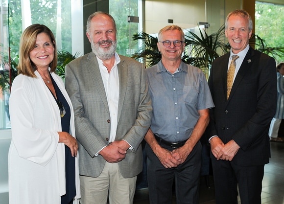 De gauche à droite : L’honorable Liza Frulla, directrice générale de l’ITHQ; Charles-Henri de Coussergues, vigneron et représentant du CVQ; Jean Joly, vigneron et représentant du CVQ; André Lamontagne, ministre de l’Agriculture, des Pêcheries et de l’Alimentation
