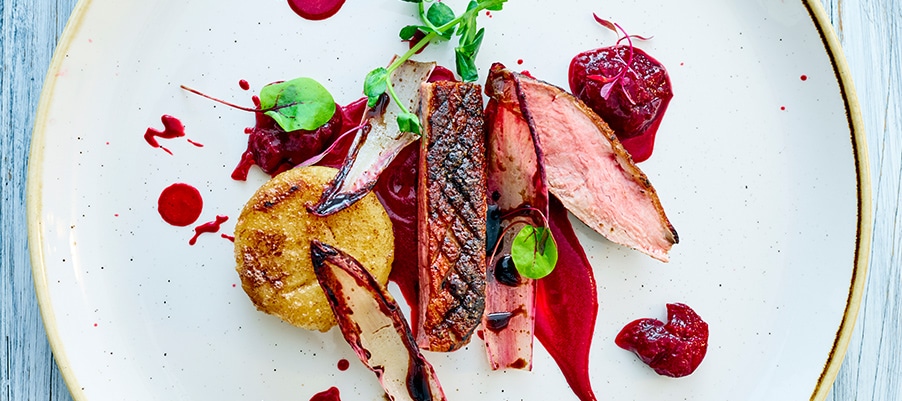 - Couper le magret en fines tranches. Déposer les patates douces au centre de l’assiette. Disposer les tranches de canard sur les patates. Verser le caramel sur le canard et servir.