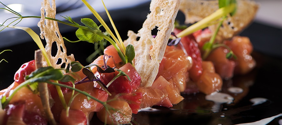 - Couper le saumon en tranches fines et assembler dans une assiette en alternant avec le saumon fumé.