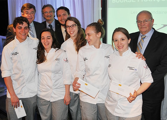 Montréal, le 1er mai 2014 – Le 28 avril dernier avait lieu à l’Institut de tourisme et d’hôtellerie du Québec (ITHQ) la 10e édition du Dîner annuel de la Bourse Françoise-Kayler, sous la présidence d’honneur de M. Michel Busch, grand gastronome reconnu. À l’occasion de cette soirée, qui a généré des profits nets de 33 000 $, dont une partie de ce montant servira à financer le Fonds de Bourse Françoise-Kayler, 5 bourses d’études individuelles, totalisant 12 500 $, ont été remises à des étudiants de l’ITHQ. Les récipiendaires sont des finissants du programme Formation supérieure en cuisine. Il s’agit de Rafaël Combet, Marina De Figueiredo, Pascaline Gouin, Florence Morissette et Jessica Noël.