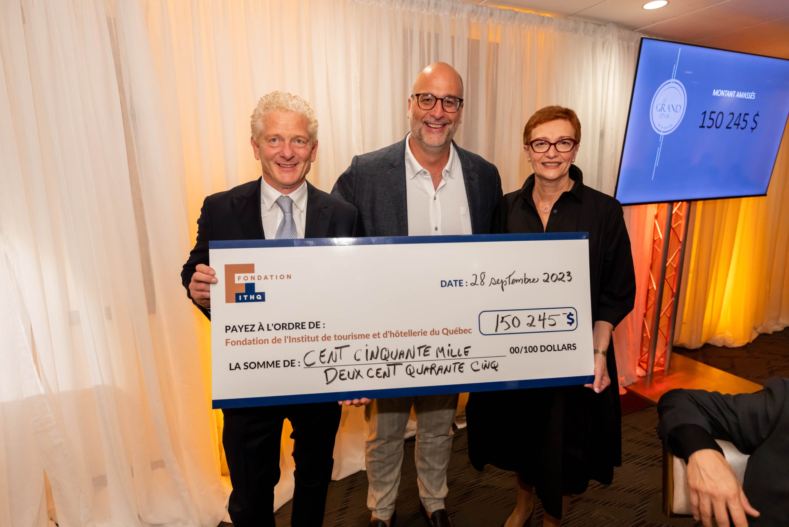 Montréal, le 2 octobre 2023 — La Fondation de l’Institut de tourisme et d’hôtellerie du Québec (ITHQ) tenait le 28 septembre dernier la 18e édition du Grand Dîner de la rentrée, sous la présidence d’honneur de M. Alfredo Napolitano, président d’Aliments O’Sole Mio. Cette soirée-bénéfice a permis d’amasser la somme de 150 245 $, montant qui servira à soutenir les projets prioritaires de l’ITHQ, et plus particulièrement le Fonds de soutien en entrepreneuriat.