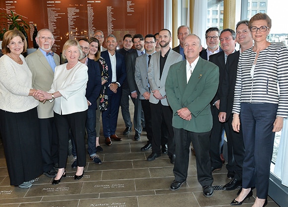 Montréal, le 5 juin 2018 – La Fondation de l’Institut de tourisme et d’hôtellerie du Québec (ITHQ) dévoilait, le 4 juin dernier, les 24 nouvelles dalles qui s’ajouteront au sol du Hall des bâtisseurs, à l’entrée de l’Institut. Pour cette 9e édition, c’est vingt-quatre diplômés et proches collaborateurs de l’ITHQ qui ont vu leur nom gravé sur une dalle, en reconnaissance de leur généreux don de 1000 $ à la Fondation. Ce geste immortalise ainsi, dans la pierre, la contribution remarquable des donateurs qui rejoignent, de ce fait, le très prisé Club des bâtisseurs. La cérémonie de dévoilement des dalles s’est conclue par un cocktail rassemblant les nouveaux membres de l’édition 2018 ainsi que des membres d’éditions précédentes.