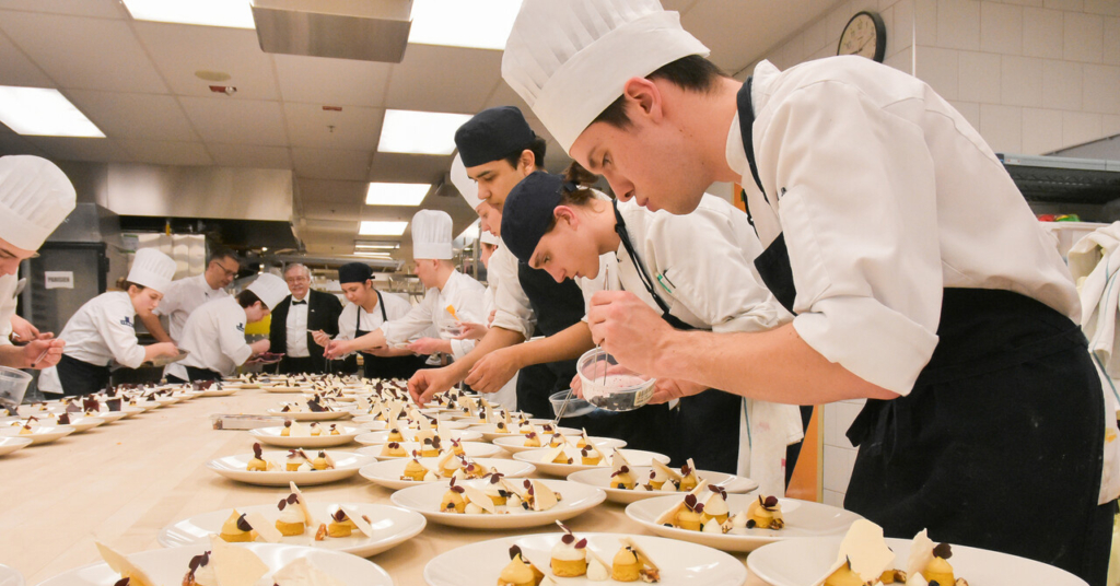 Ce copieux repas a mis de l’avant le talent des étudiantes et étudiants du programme Formation Cuisine supérieure, accompagnés de leurs professeurs Messieurs Gilles Herzog et Benoit Lenglet. Les étudiants du programme Service de la restauration gastronomique, accompagnés de leur professeur M. Luc Cockenpot, ont assuré les 6 services de la soirée. Les accords mets-vins furent sélectionnés par la maître-sommelière Sabina Da Costa, diplômée de l’ITHQ et concierge Clefs d’or au Ritz-Carlton Montréal.