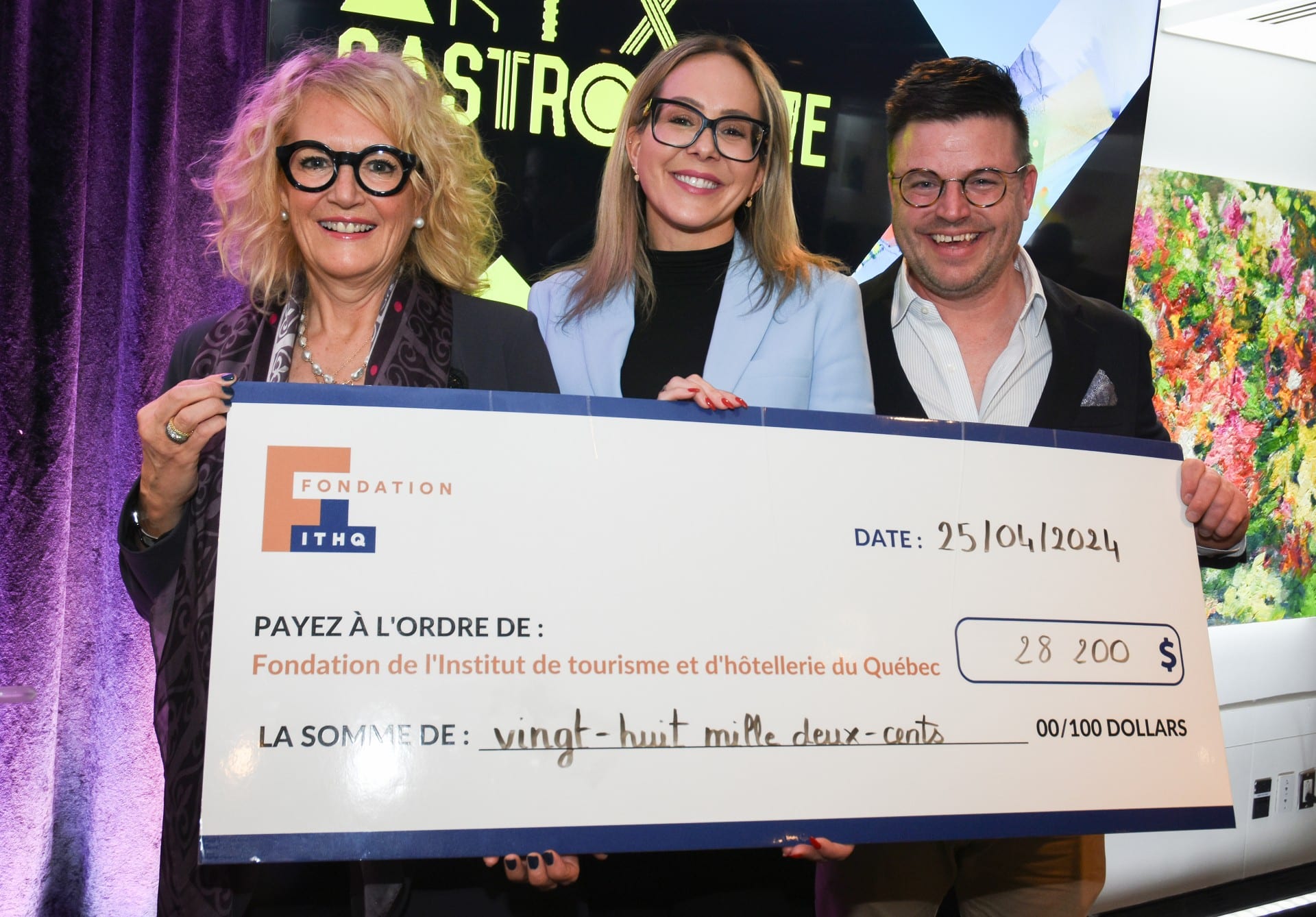 Montréal, le 26 avril 2024 – La Fondation de l’Institut de tourisme et d’hôtellerie du Québec (ITHQ) tenait, le 25 avril dernier, la neuvième édition de sa Soirée Art X Gastronomie. Cette activité-bénéfice, avec à titre d’invité d’honneur Monsieur Danny St-Pierre, diplômé de l’ITHQ et aujourd’hui chef et propriétaire du restaurant Pan American Pizza, a permis d’amasser la somme de 28 200 $ au profit de la Fondation de l’ITHQ, dont une partie versée à la bourse Cassandre-Paquette.