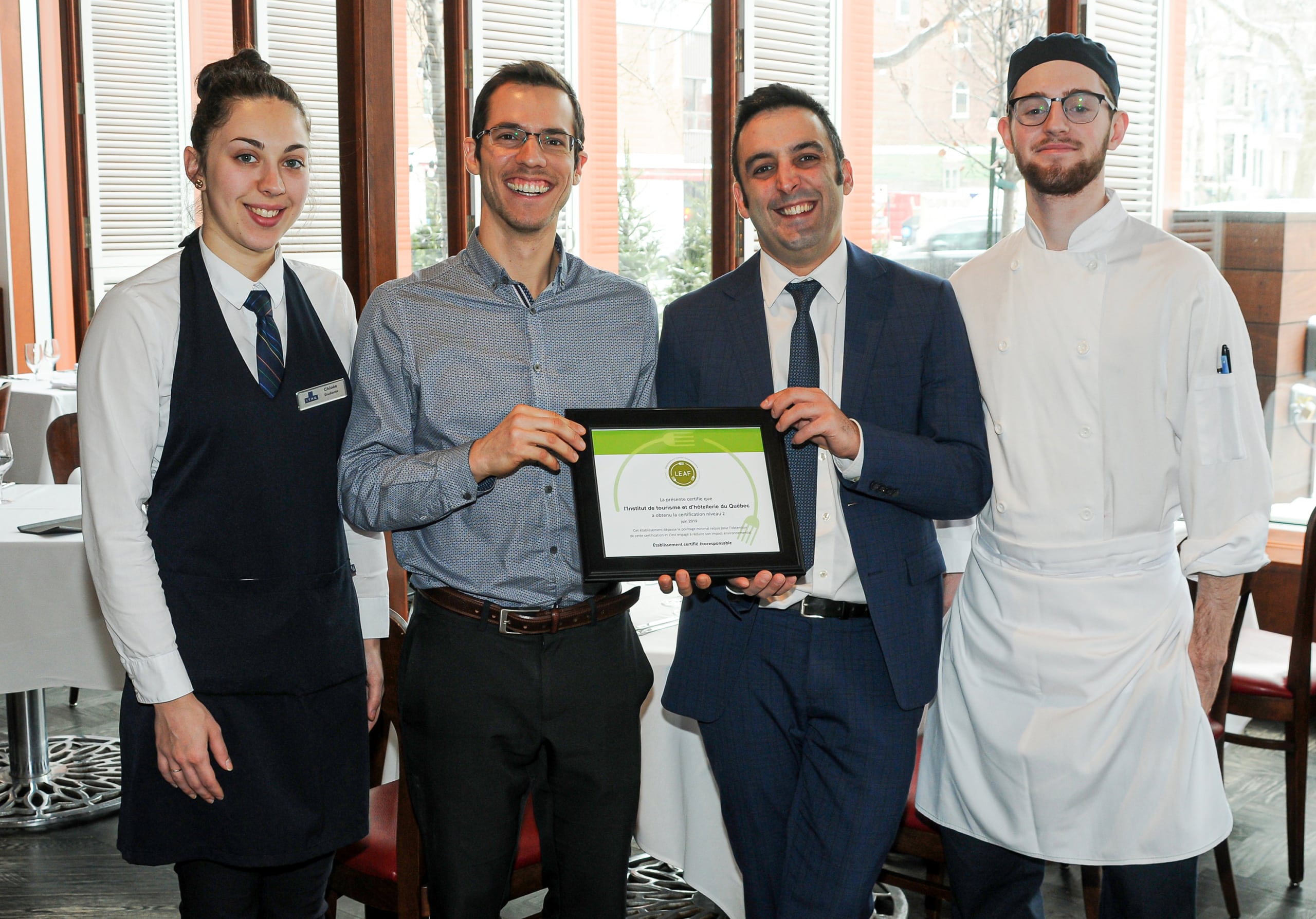 Montréal, jeudi 23 janvier 2020 –L’Institut de tourisme et d’hôtellerie du Québec (ITHQ) poursuit son virage vert et gravit les échelons des évaluations de deux organismes canadiens de certification environnementale. L’Hôtel de l’ITHQ obtient ainsi une 4e Clé verte sur une échelle de 5, attestant de ses engagements écoresponsables; quant à eux, le Restaurant de l’ITHQ et tous ses services alimentaires se voient octroyer le 2e des 3 niveaux de certification LEAF, un organisme spécialisé en normes durables dans le domaine de la restauration.