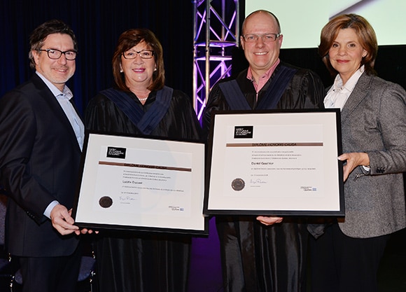 Montréal, le 18 novembre 2015 – L’Institut de tourisme et d’hôtellerie du Québec (ITHQ) a honoré hier Mme Lucille Daoust, ex-directrice générale de l’établissement, et M. Daniel Gauthier, président du conseil d’administration du Groupe Le Massif. L’honorable Liza Frulla, C.P., directrice générale de l’ITHQ, et M. Paolo Di Pietrantonio, président du conseil d’administration, ont remis à Mme Daoust et à M. Gauthier un diplôme honoris causa lors d’une cérémonie au Palais des congrès de Montréal, pour la contribution exceptionnelle de ces personnalités à l’industrie du tourisme, de l’hôtellerie et de la restauration au Québec et à l’international.