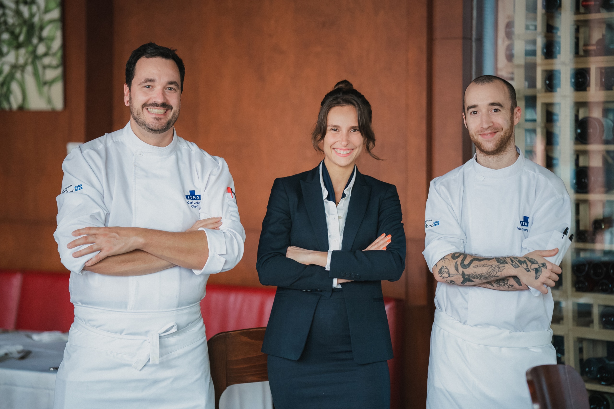 Diplômé du programme Cuisine française de l’ITHQ en 2002, Carl Jobin a collaboré à de belles tables, telles que le F Bar et L’Atelier de Joël Robuchon au Casino de Montréal. Éric Champagne a complété sa formation en pâtisserie en 2005. Fort d’une dizaine d’années d’expérience dans le domaine de la restauration, il a notamment travaillé aux restaurants H4C par Dany Bolduc et HVOR. Diplômée en 2013, Marie-Pier Burelle a suivi avec succès la formation Gestion hôtelière internationale. Elle a œuvré au Manoir Hovey et au restaurant Le Serpent. Elle fera équipe avec Eric Chevrier, maitre d’hôtel depuis 10 ans au Restaurant de l’ITHQ.